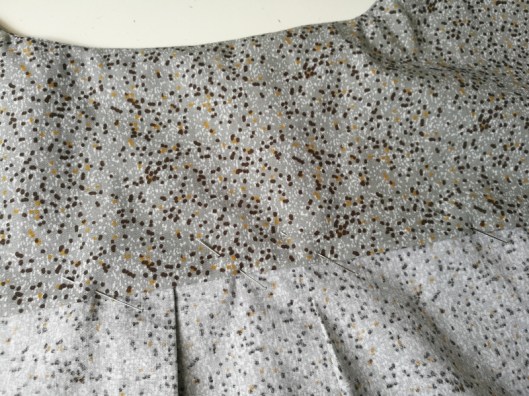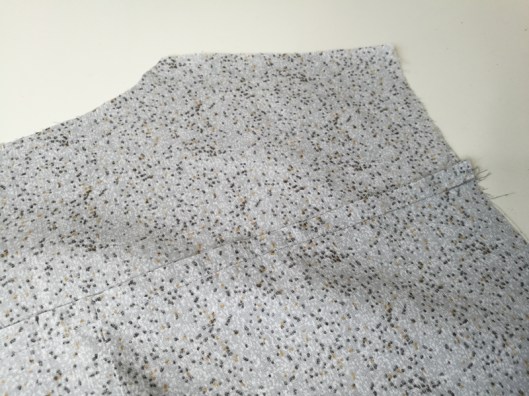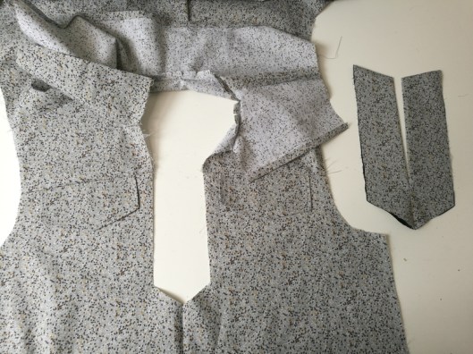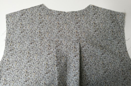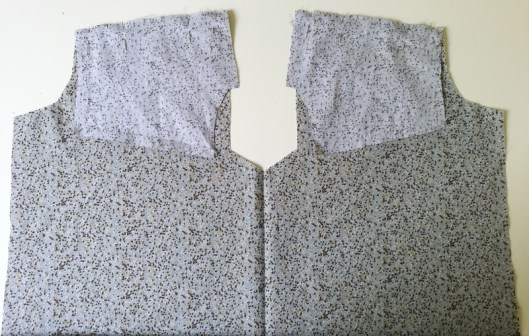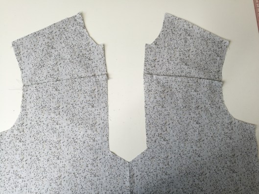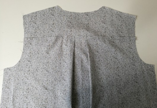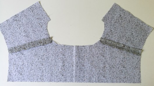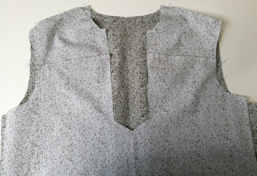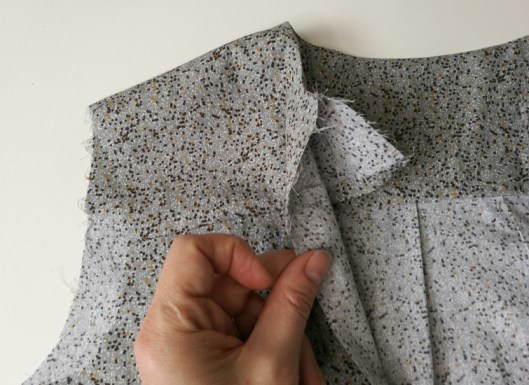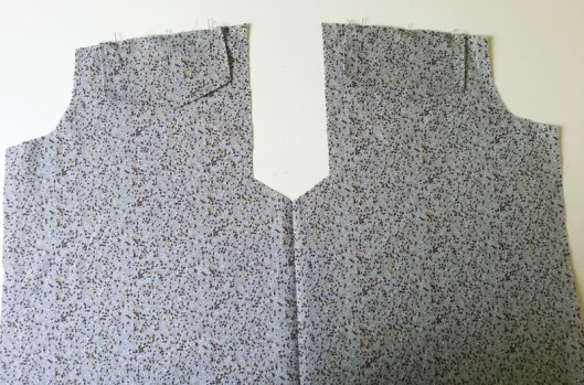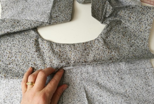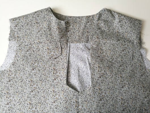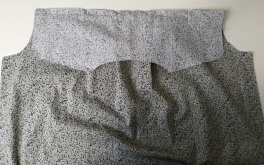 Sur la photo ci-dessous, on voit que je n’ai cousu que le bord de l’encolure, le bord devant de l’empiècement est laissé libre :
