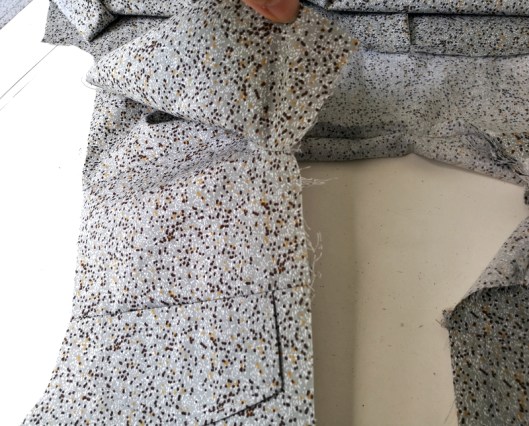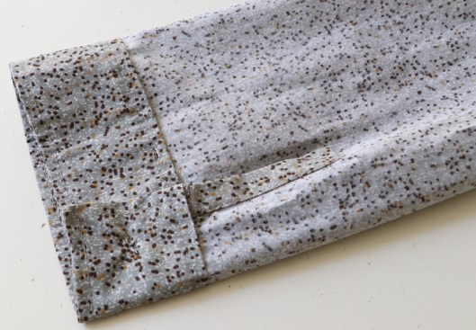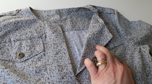 Arrive ensuite l’étape des poignets de manche boutonnés et des fentes indéchirables que je ne détaillerai pas ici (j’ai utilisé la technique que présente Pauline Alice pour la blouse Carme). Ici les poignets ne sont pas entoilés alors qu’ils devraient l’être. J’économise en effet le peu d’entoilage qu’il me reste…
