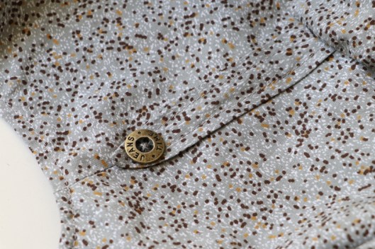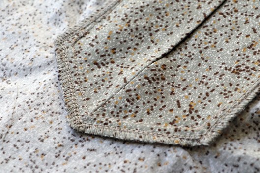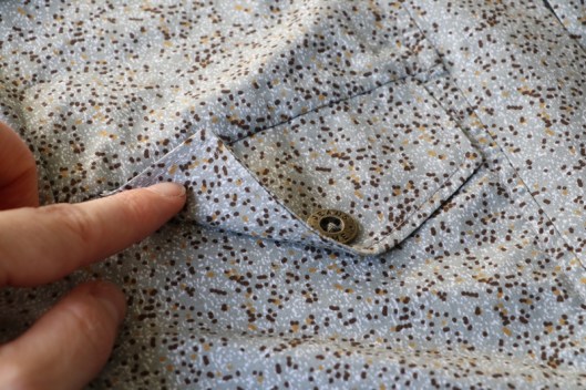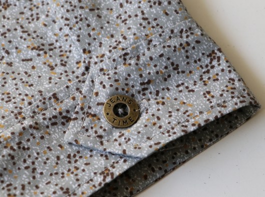 Je précise que je n’ai pas cousu les fonds de poche, ce sont donc de fausses poches… Pas de boutonnière, j’ai cousu le bouton sur toutes les épaisseurs.