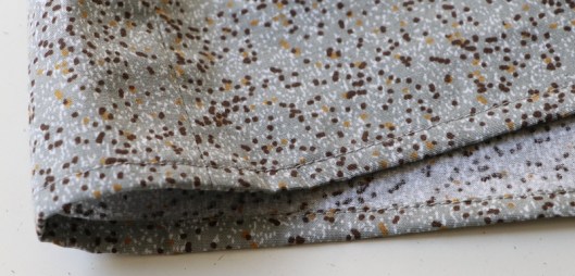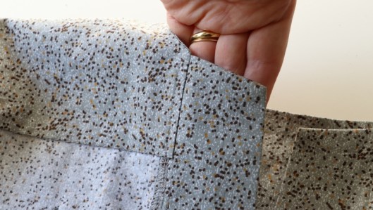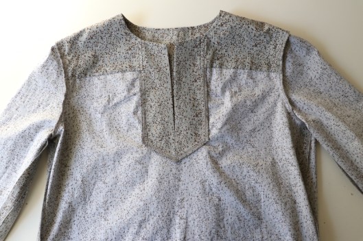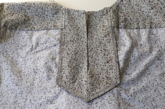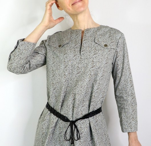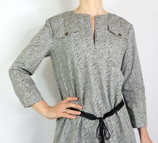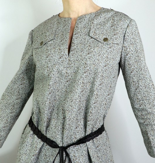 Comme vous pouvez le voir, je n’ai pas cousu le parement prévu en bas de robe. Du coup, j’ai une tunique et je préfère nettement ce style. Du coup, je n’ai pas cousu les poches prises dans les coutures.