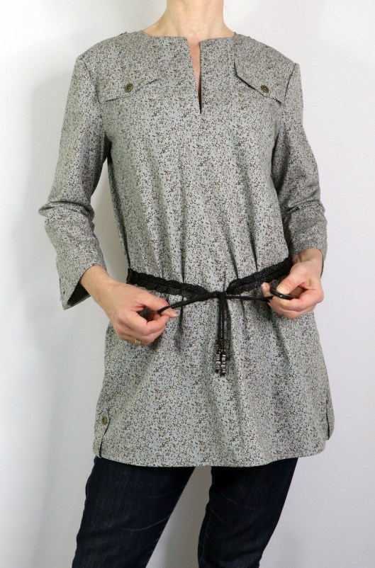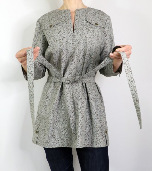 Clairement, je préfère quand cette tunique est ceinturée ! Burda propose de coudre un grand lien qu’on vient nouer au devant, histoire de cintrer la blouse à la taille. Il est un peu trop grand pour moi, faudrait que je le raccourcisse.