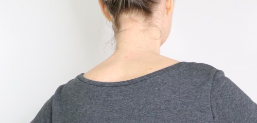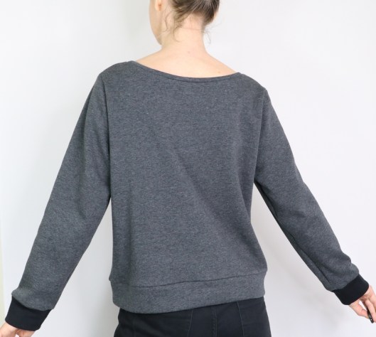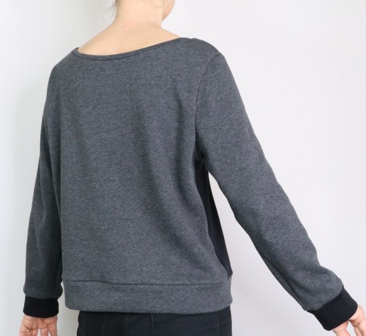 Autre détail qui a son importance : l’encolure est pas mal décolletée devant et dos. De tous les sweats que j’ai cousus jusqu’à présent c’est celui-ci qui est le plus dégagé au niveau de l’encolure et je n’y suis donc pas très habituée. Je regrette un peu de ne pas avoir soutenu les coutures d’épaule avec du framilastic car j’ai l’impression que ça va se détendre un peu au fur et à mesure du porté…