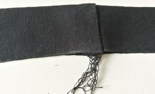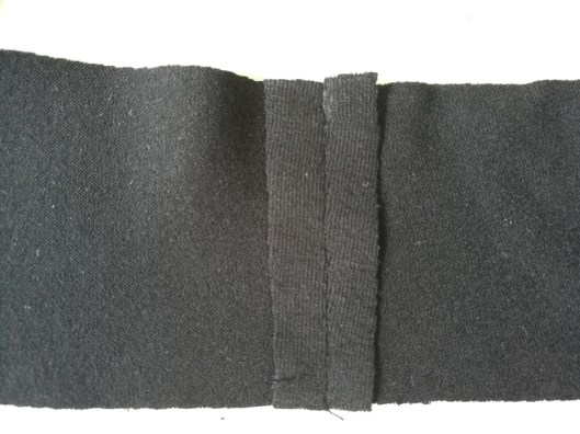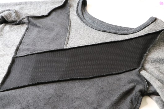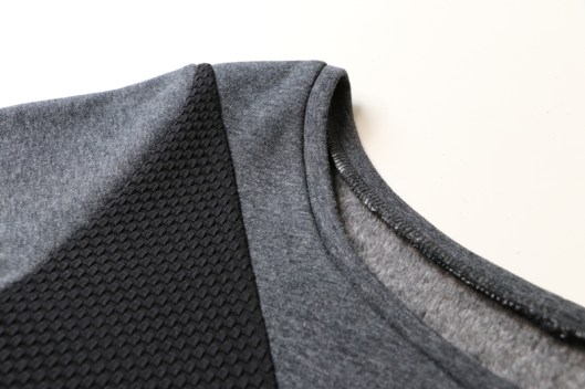 Ca permet entre autres d’éviter les surépaisseurs au niveau de la couture des épaules et celles de la bande d’encolure. Petit conseil au passage, que m’avait donné Marmotta, il est préférable de fermer la bande à la machine à coudre plutôt qu’à la surjeteuse, histoire de pouvoir ouvrir la couture.