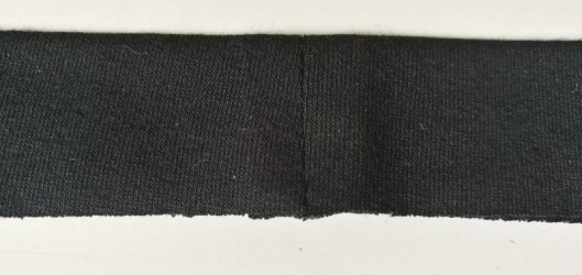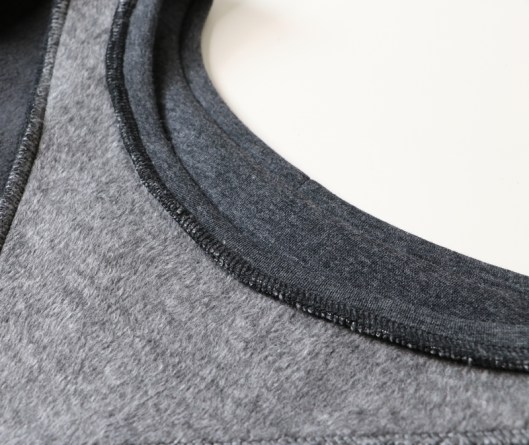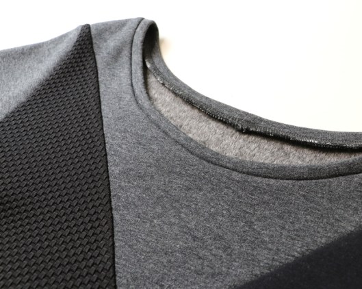L’encolure est finie par une fine bande. Je la trouve à mon goût un peu trop étroite, ce qui ne facilite pas la pose de celle-ci lors de l’assemblage. Je n’ai pas respecté les crans de montage. Je préfère en effet que la couture d’assemblage de la bande se retrouve au milieu dos de mon sweat plutôt qu’au niveau de l’épaule.
