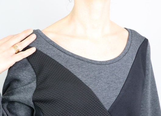 Ton sweat est sympa avec toutes ces découpes. Effectivement, je trouve l’encolure un peu trop échancrée à mon goût, qui dit sweat, dit fraicheur…..j’aurais froid au cou !!!