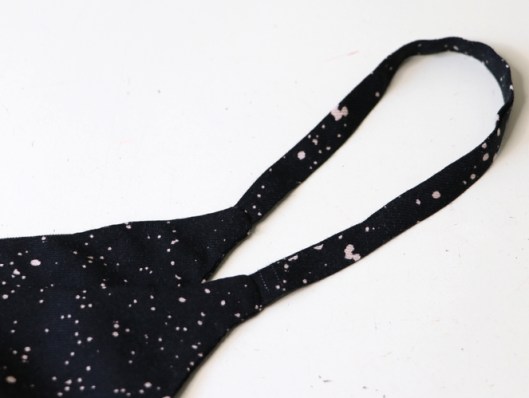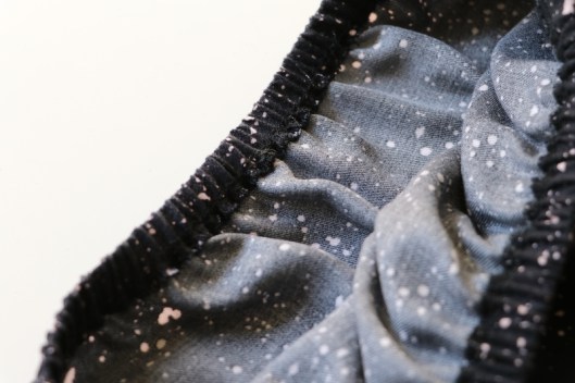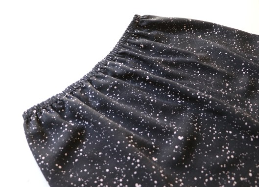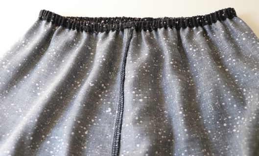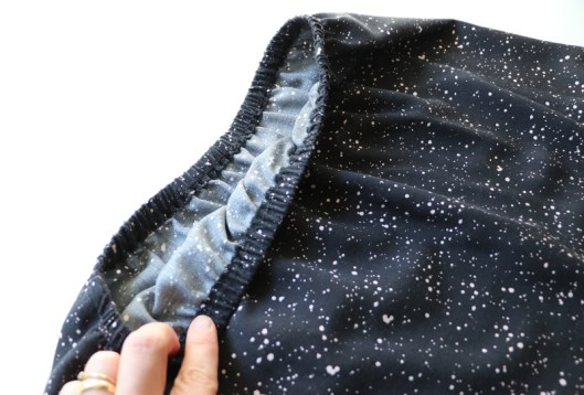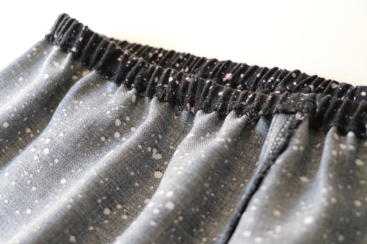 Il s’agit d’un simple ourlet surjeté de 2 cm dans lequel j’ai inséré un élastique de 1 cm :