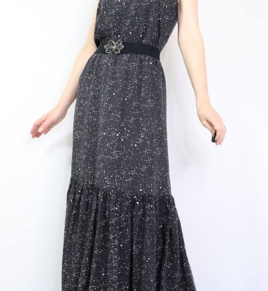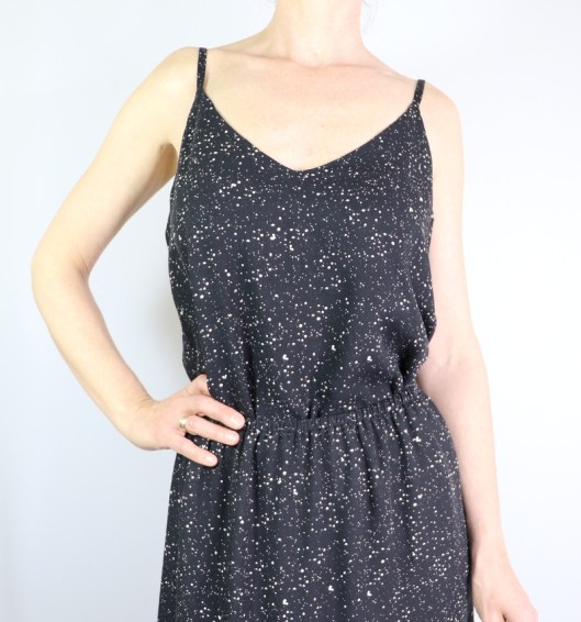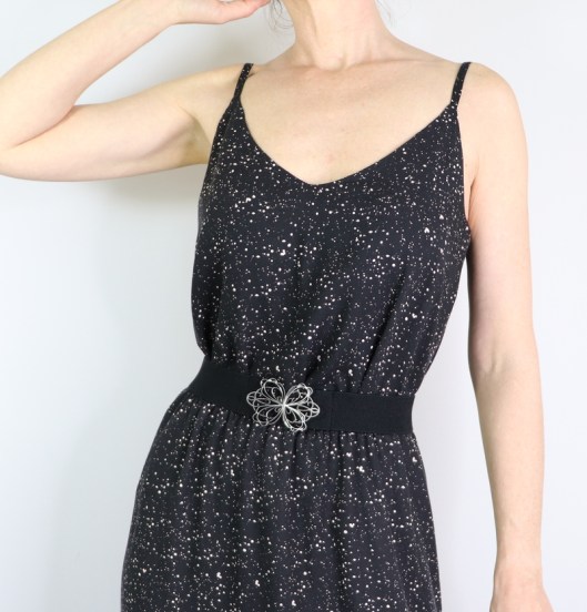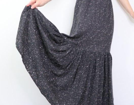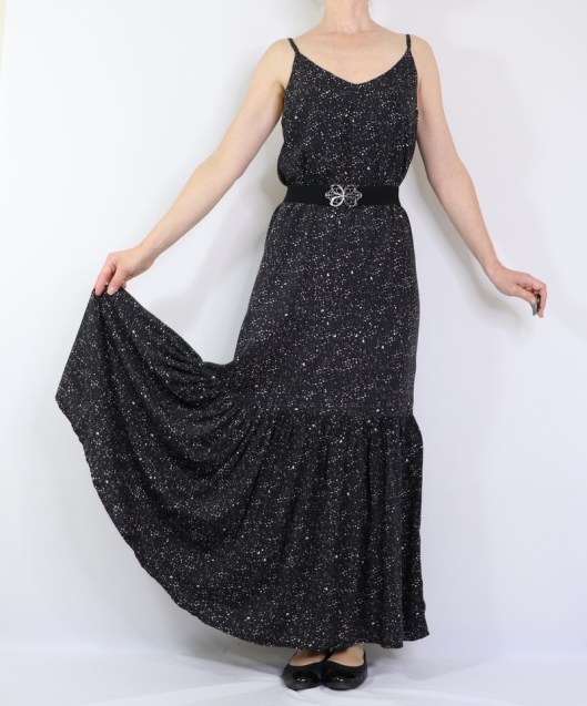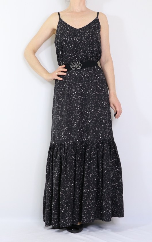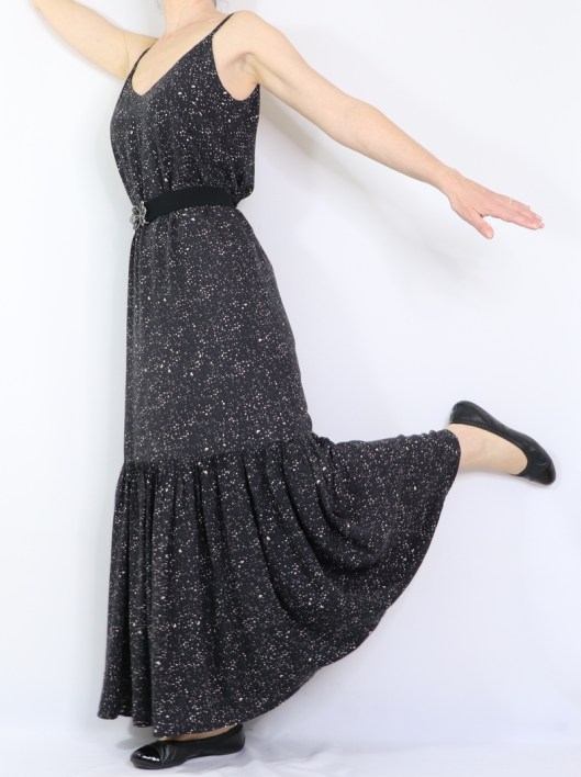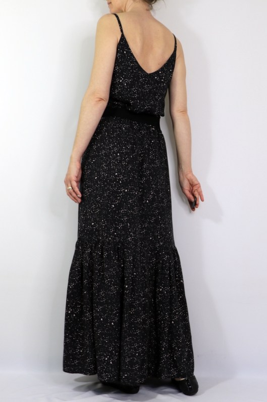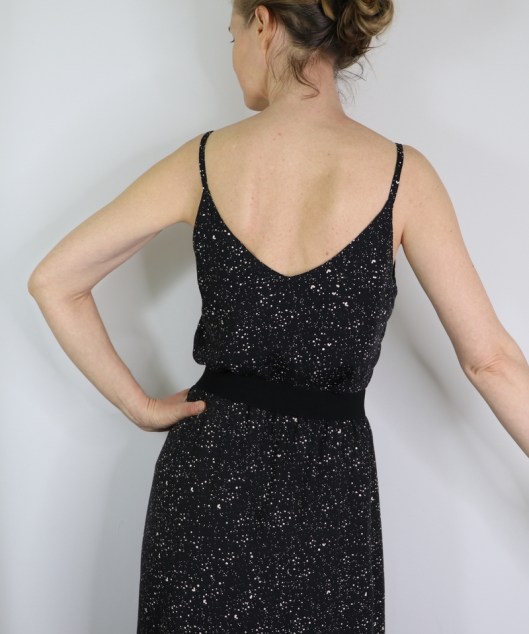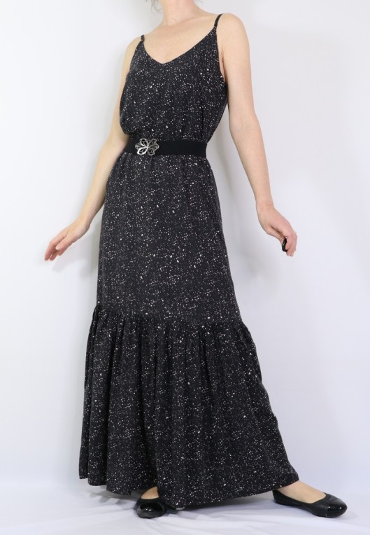 On pourrait croire que c’est une robe mais en fait non : il s’agit bien d’un top façon caraco et d’une jupe longue ! J’ai en effet voulu optimiser au mieux un coupon de viscose que j’ai acheté chez Bennytex : 13,80 € les 2 mètres. Chez Bennytex, la coupe est généreuse, j’ai donc reçu 2m20 de ce tissu « fibranne viscose toucher pashmina » dont le rapport qualité/prix est vraiment topissime !
