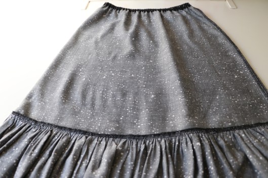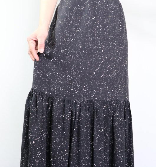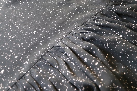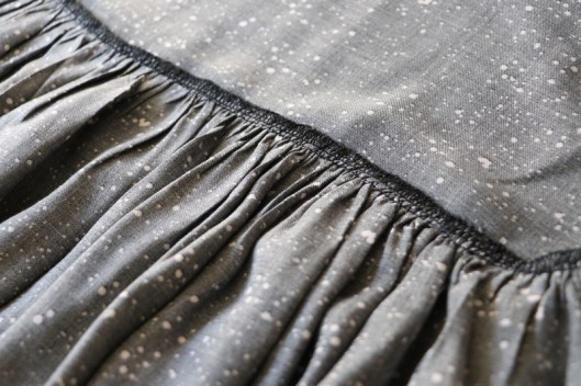 Le bas la jupe est un simple rectangle froncé (sur toute la laize), histoire de donner de l’ampleur à la jupe et de pouvoir marcher aisément sans être entraver dans mes mouvements :