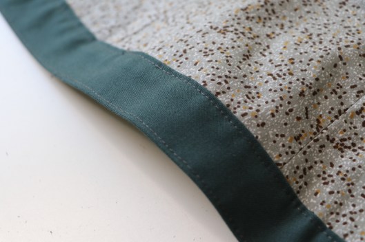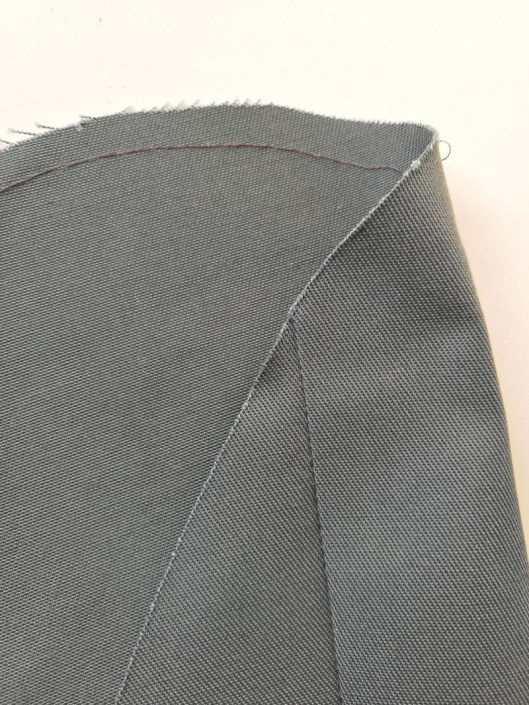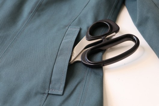 Côté tissu, je vous conseille d’utiliser un tissu ayant de la tenue : jean, gabardine, lin, simili cuir. J’ai pour ma part opté pour cette gabardine de coton souple achetée en ligne chez Bennytex, d’une belle qualité pour le prix (5,90€/m). Seule la couleur m’a gênée… le site indique « vert viride » qui s’approchait pour moi à du kaki, ma couleur préférée du moment. Or, à la réception de celui-ci, petite déception : cette couleur m’a de suite fait penser aux blouses/tabliers de chez Truffaut…