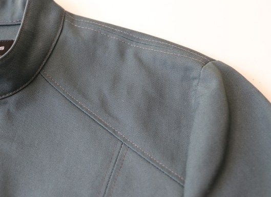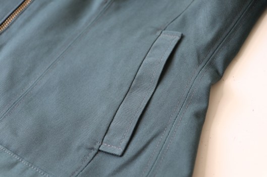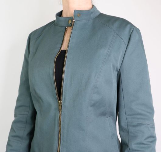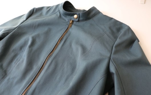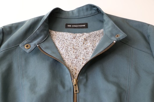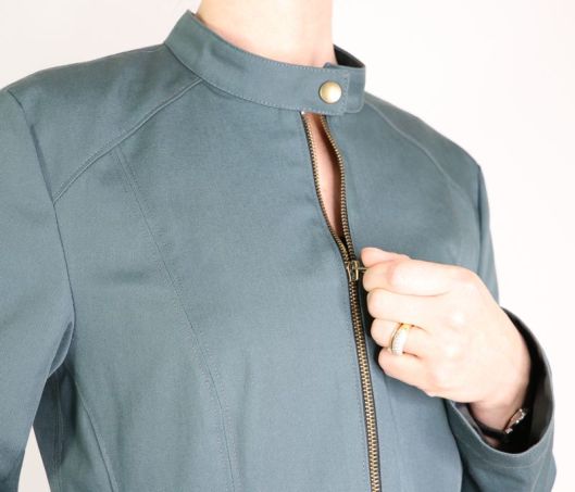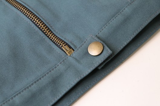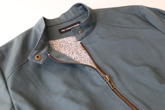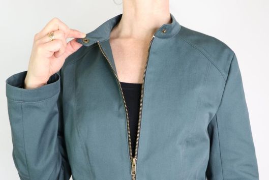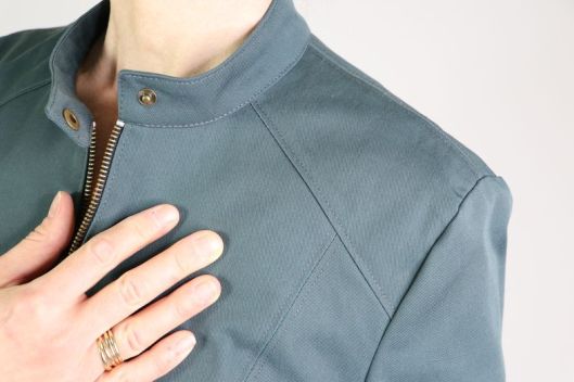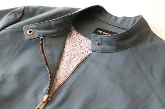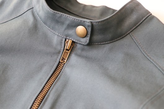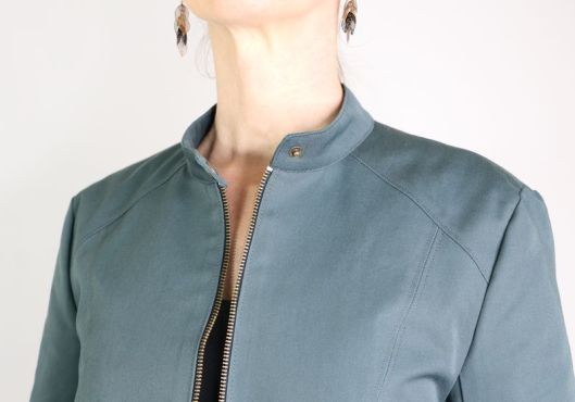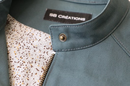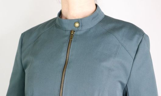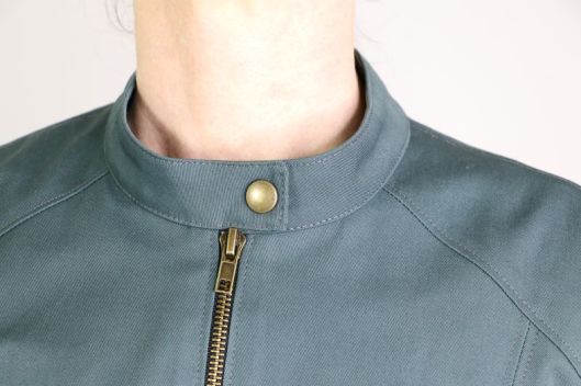 Au-dessus du zip, on retrouve un col droit à patte boutonnée de type byker. J’ai décidé d’entoiler le dessus du col, pour lui donner davantage de tenue.