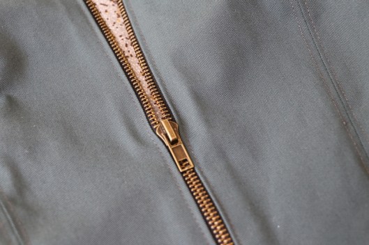 Le zip que j’avais en stock était trop long, je l’ai donc raccourci en ôtant quelques maillons avec une pince puis ai remis aux extrémités des arrêtoirs (merci Marie-Christine pour le bon terme !) qui viennent stopper le curseur du zip. Opération délicate (j’en ai cassé plusieurs) mais ça se fait… D’ailleurs, voici quelques précisions transmises par Marie-Christine : « il ne faut pas vouloir les enlever complètement avec la pince mais juste les ouvrir un peu pour dégager les petits ergots du tissu et ensuite les dégager avec les doigts, comme des agrafes« . Ici l’arrêtoir est de couleur argenté alors que le zip est de couleur bronze. Mais ça passe, ça ne choque pas trop…