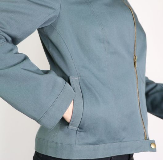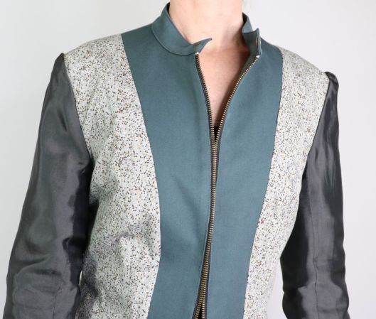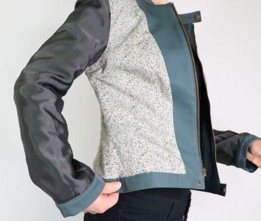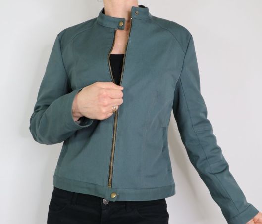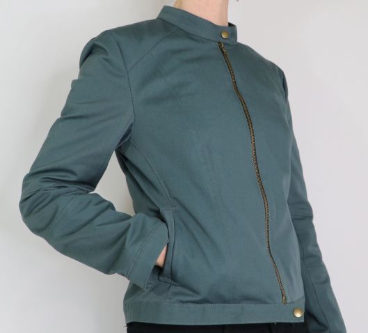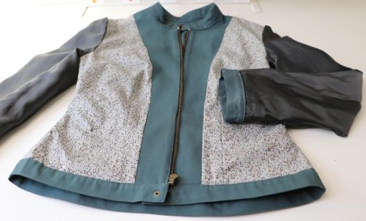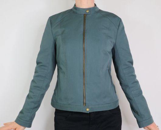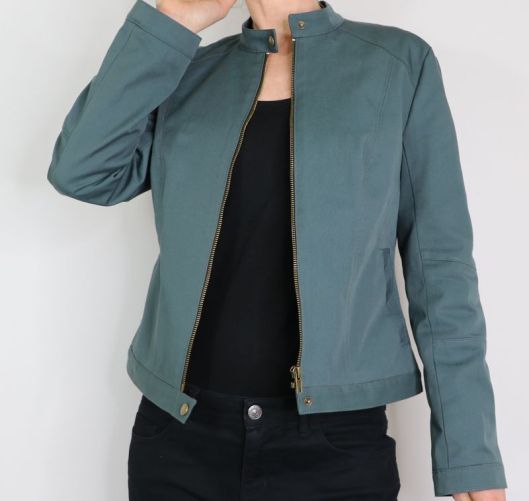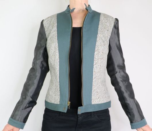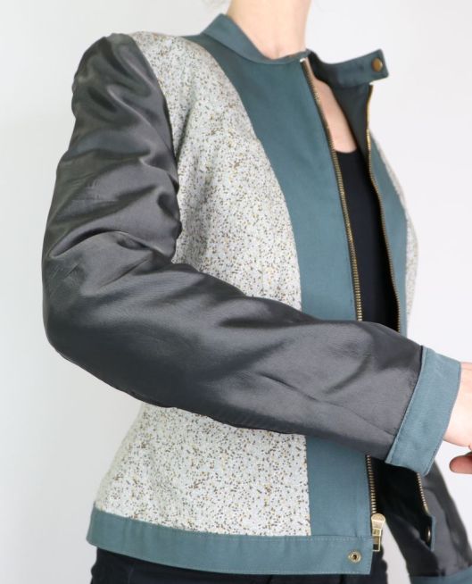 Il s’agit du modèle n°4305 de Lekala Patterns : une veste ajustée, courte, zippée au milieu devant. Les manches longues sont finies par des poignets boutonnés. L’originalité de ce patron, ce sont les multiples découpes et empiècements surpiqués au devant, au dos et aux manches. La veste se ferme au cou par un col de type byker (avec patte). Idem pour la ceinture. Les poches sont passepoilées zippées, insérées dans la découpe princesse du devant. La veste est intégralement doublée.