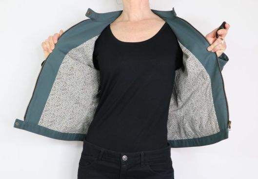 Je n’ai pas pris de photos avec les différentes étapes d’assemblage mais voici quand-même quelques éléments… J’ai cousu dans un premier temps toute la veste côté extérieur (sauf col, ceinture, poignets), puis toute la veste côté intérieur/doublure (sauf col, ceinture, poignets). J’ai ensuite cousu le zip au milieu devant que j’ai pris en sandwich entre les deux vestes (ext. / int.). Les bords supérieurs (encolure) et inférieurs (bas de la veste) et les bords du bas des manches sont donc ouverts. Je n’ai donc pas eu besoin de laisser une ouverture dans l’une des manches ou dans une découpe pour retourner la veste sur l’endroit. Une fois retournée, le milieu devant pressé au fer, les surpiqûres du zip faites, je me suis donc retrouvée avec la veste dont il ne manquait plus que le col, la ceinture et les poignets. Ceux-ci ont été cousu simplement et de façon traditionnelle comme si je n’avais qu’une seule épaisseur de tissu. Si vous n’avez jamais cousu de col ou ceinture avec pattes, je vous conseille d’aller voir le tuto vidéo que propose Elsa d’Uban Fairy pour la robe Antigone. Le principe est quasi le même !