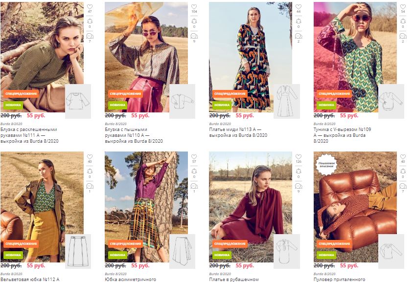 D’ailleurs, au moment où je rédige cet article, la plupart des patrons sont au prix imbattable de 55 roubles, soit 0,65€ le patron PDF (ci-dessus, par exemple ce sont des patrons du magazine d’août 2020) et si vous mettez le code promo « PROMO70 » (apparemment il fonctionne encore), vous aurez en plus 70% de réduction (je dis ça, je dis rien…).