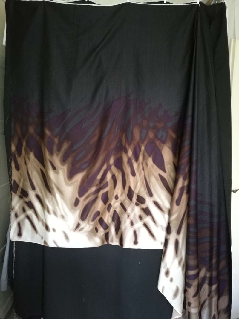 Ce coupon est un peu particulier car il s’agit d’un tissu à panneau, avec des motifs qui se déploient dans le sens de la longueur comme vous pouvez le voir ci-dessous. Pour la coupe, j’ai donc coupé toutes mes pièces dans le sens inverse du droit-fil, histoire d’être dans le sens de l’imprimé :