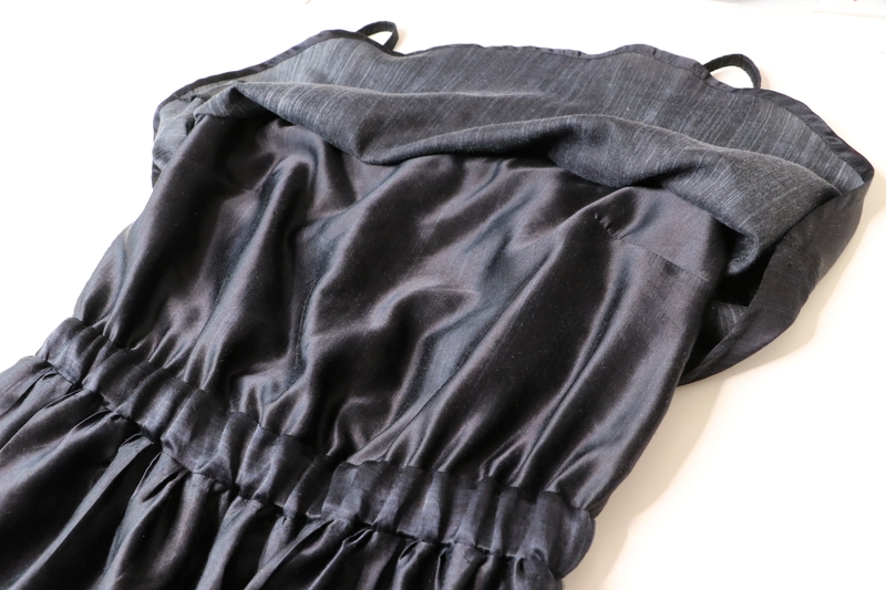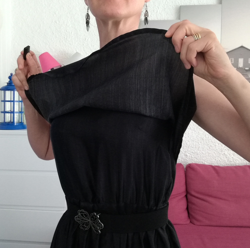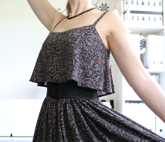 Bonjour, Cette robe est vraiment très jolie ! tout est dans le tissu à base et le sur-corsage. Et c’est parfait avec ta ceinture à boucle-fleur. C’est vrai que beaucoup de fronces à la taille n’est pas toujours très seyant, il semble qu’il y en ait déjà pas mal même après que tu aies réduit. Je trouve que cette robe-ci en soie tombe mieux que la précédente en viscose, c’est dû à la matière plus chatoyante je pense.
