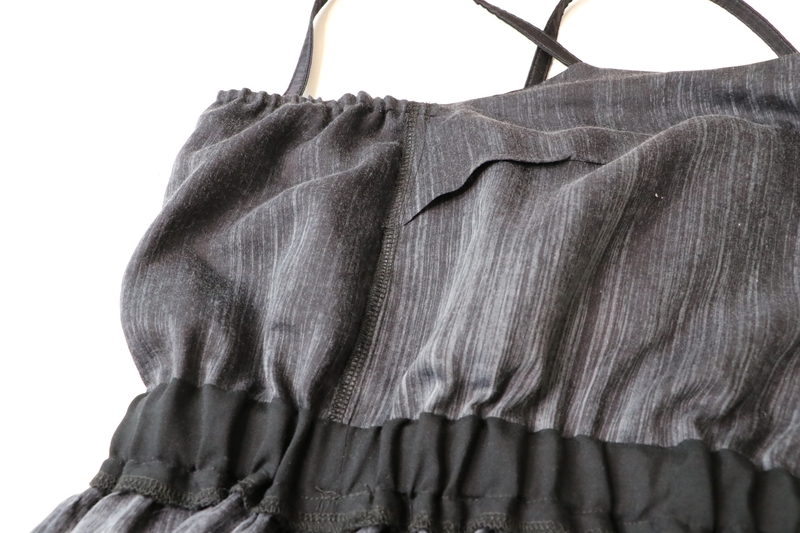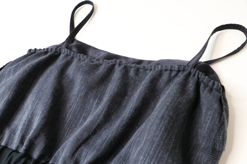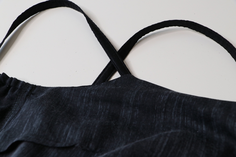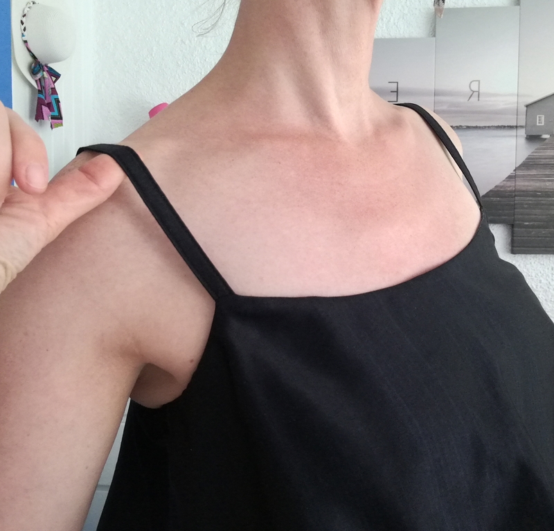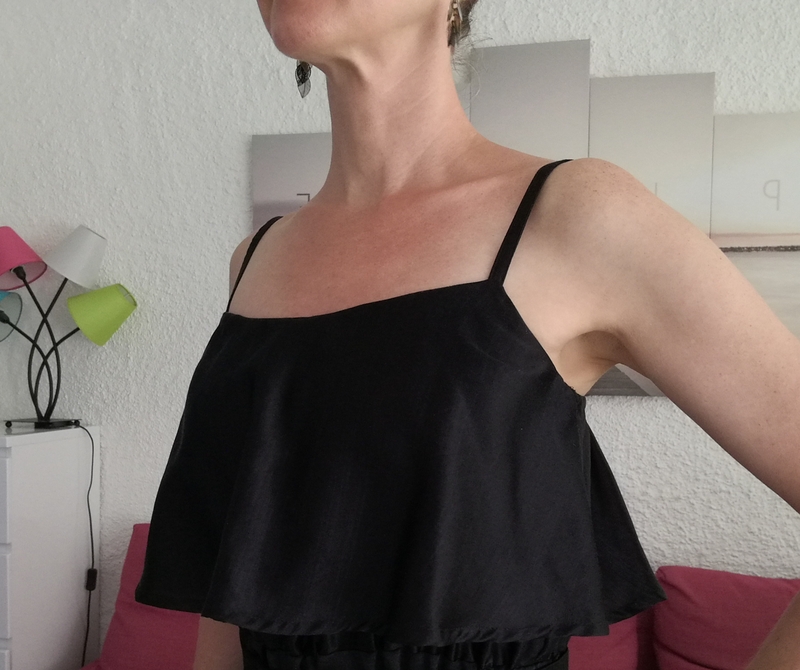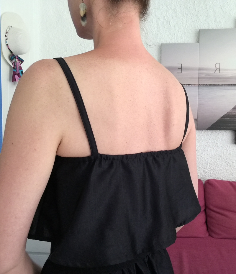 Les bretelles sont prises en sandwich entre le corsage et le volant. Pour info, j’ai réduit la longueur des bretelles de 4 cm. Ici, elles sont cousus à la façon du top Ségur.
