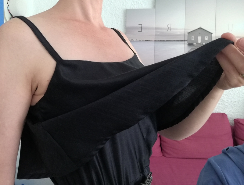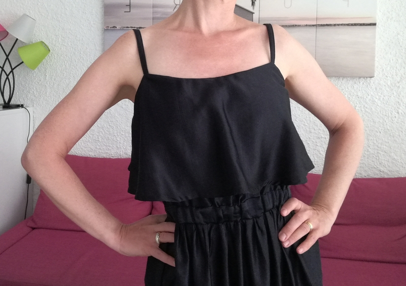 Pour la finition du volant, Burda préconise de faire un double rentré, ce que j’ai fait mais ce n’était pas évident à faire puisque le volant est courbe/arrondi… Du coup, ça vrille un peu… J’aurais donc dû faire comme pour ma première version, à savoir un simple ourlet surjeté piqué…