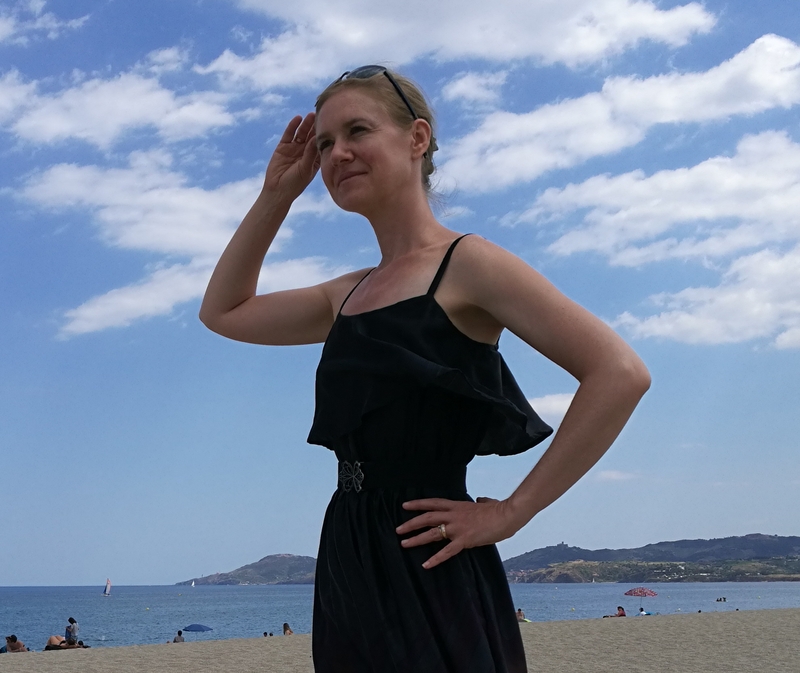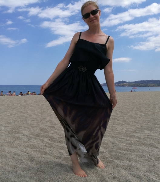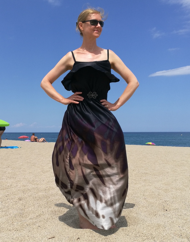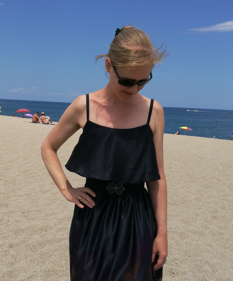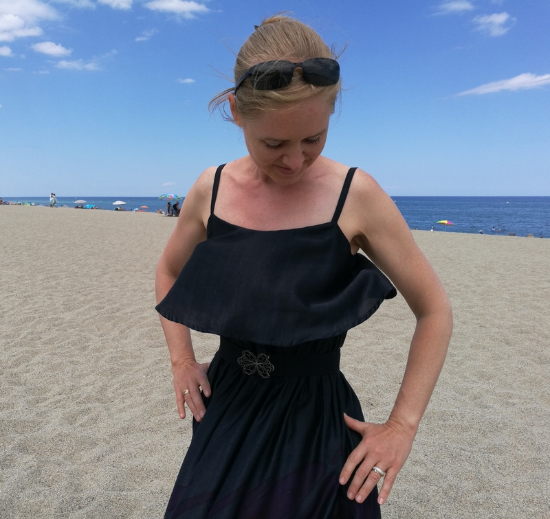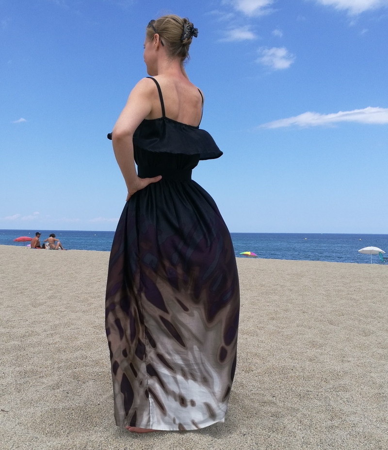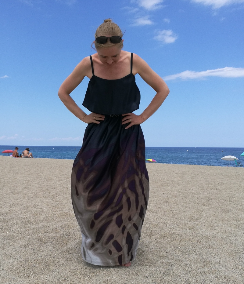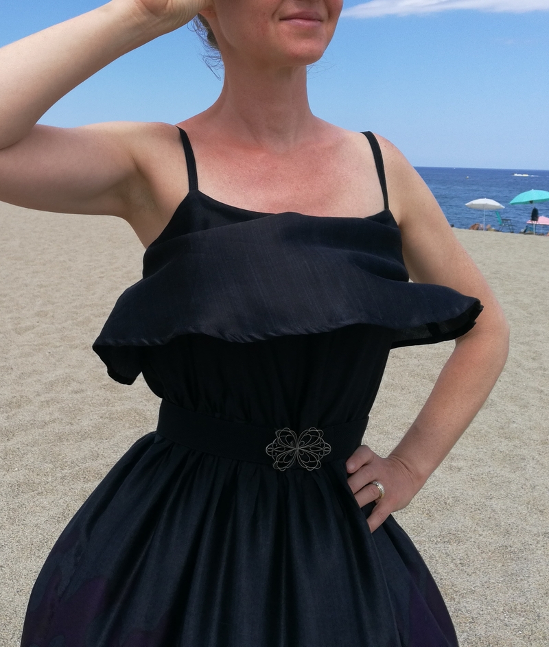 Difficile de prendre cette robe en photo avec ce vent en bord de mer… A certains moments, on aurait pu croire que c’était une robe montgolfière, cette soie étant tellement légère et vaporeuse ! Du coup, sur les photos ci-dessous, ça donne un côté bouffant à la partie jupe…