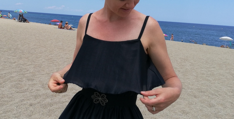 Pour cette version, je n’ai pas suivi les instructions de montage qui concerne la ceinture élastiquée : j’ai en effet pris en sandwich le corsage dans la ceinture, histoire de cacher les marges de couture. J’aurais pu faire la même chose au niveau de la partie jupe mais il aurait fallu pour ce faire que je le fasse à la main par des points invisibles mais j’étais un peu pressée par le temps (robe réalisée juste avant de partir en vacances…) :