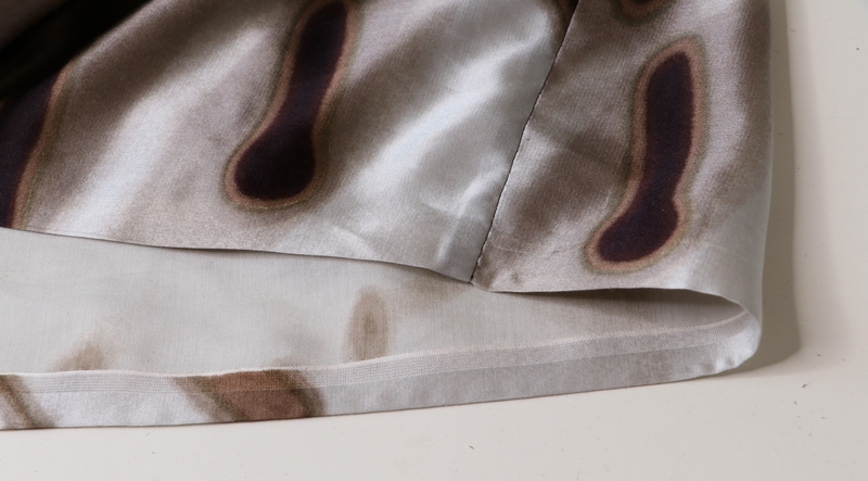 Côté ourlets, Burda préconise de faire un double rentré. Ici, j’ai fait un simple rentré que je n’ai ni surjeté ni piqué. Et c’est bien la première fois que je fais ça ! J’ai en fait utilisé le bord de la jupe (lisière) : lors de la coupe de ce tissu, je me suis en effet arrangée pour ne pas couper le bord net du panneau. Ensuite, pour éviter d’avoir à piquer mon ourlet (sur de la soie, je trouve ça assez inesthétique d’avoir une ligne de piqûre…) et bien j’ai osé utiliser un ruban double face spécial ourlet. Sacrilège (encore un !). Et bien figurez-vous que le résultat est sacrément convaincant, j’en suis la première étonnée ! Je pense qu’il faut utiliser un ruban ultra fin pour éviter d’avoir un aspect cartonné. J’avais dans mon stock ce ruban acheté trois sous chez Fil 2000 qui a vraiment fait l’affaire, j’en suis plus que ravie ! L’idée m’est venu de tenter cette « technique » grâce à Virginie alias « L’Atelier de Vie » qui en parlait dans l’un de ses derniers podcasts. Merci Virginie pour l’astuce !