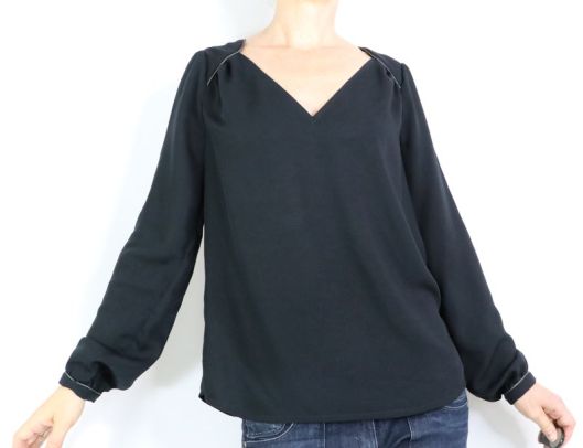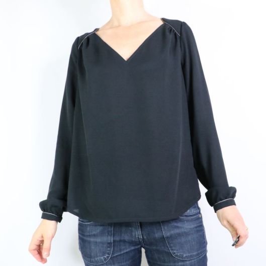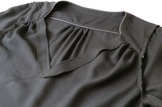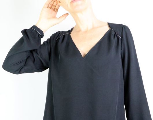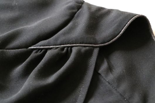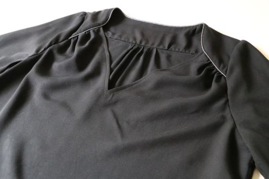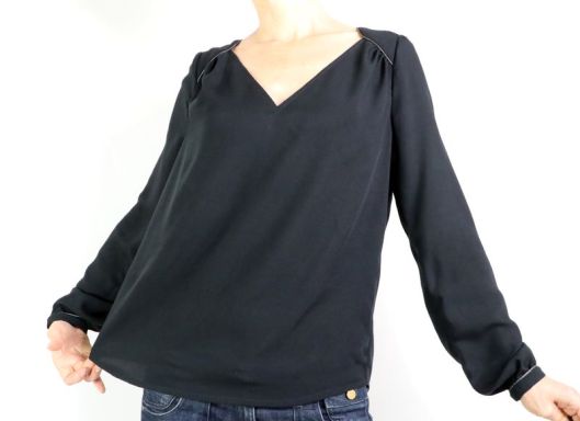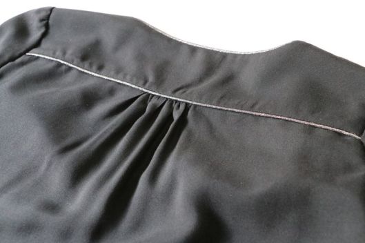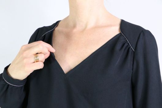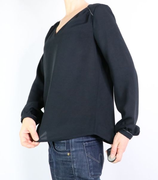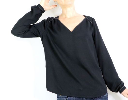 Côté tissu, la marque conseille une étoffe de type viscose, crêpe, soie… bref un tissu fluide. J’ai donc opté pour une viscose noire de chez Driessen Stoffen achetée 3€/m. Rapport qualité/prix, parfait ! Elle est fine (un peu transparente), légère et fluide. Tout à fait en accord pour ce modèle de blouse même si, à manipuler c’est tout de même un peu plus difficile car la viscose est, comme vous le savez, un tissu quelque peu fuyant… Pour corser la chose, je ne l’ai pas amidonnée, histoire que j’apprenne à maîtriser ce genre d’étoffe ! Pour la version blouse à manches longues, il est indiqué un métrage de 1m70.