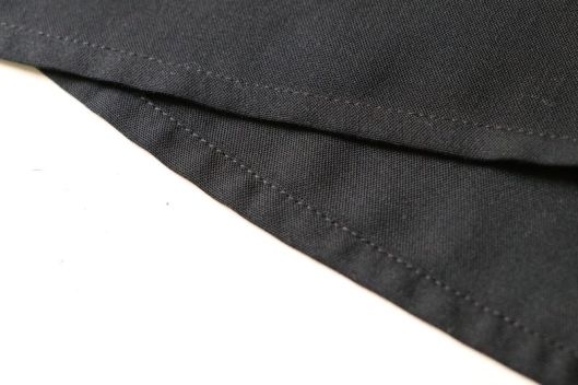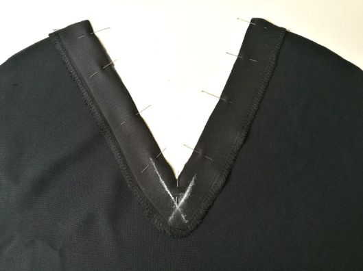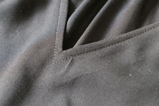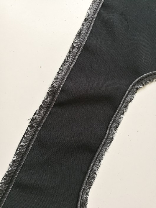 Curieusement, le patron n’indique pas d’entoiler. Perso, j’ai entoilé l’empiècement (extérieur), la parementure devant et les poignets. J’ai également ajouté un entoilage supplémentaire au niveau de la pointe du V au devant, histoire de renforcer cette partie.