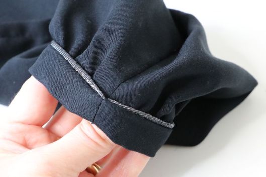 Pour l’ourlet du bas de la blouse, j’ai fait un double rentré de 1 cm comme conseillé sauf que moi je fais la surpiqûre côté envers et non côté endroit (préférence personnelle).