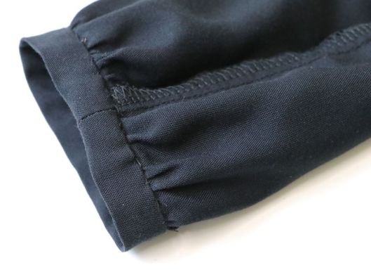 Les manches sont montées à plat. Ce que je n’ai pas fait. Je préfère les coudre de façon traditionnelle (couture des manches, puis couture des côtés du corsage, puis assemblage des manches au corsage). Du coup, je n’ai pas non plus suivi les instructions pour la pose des bracelets de manches qui sont là aussi cousus à plat.