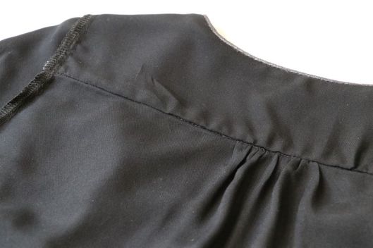 Il y a des fronces au devant sous l’empiècement. J’ai réparti un peu différemment les fronces alors que j’aurais dû, je pense, suivre les conseils de la créatrice, à savoir froncer même au niveau de la parementure devant…