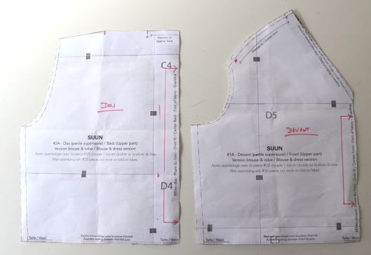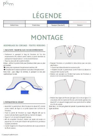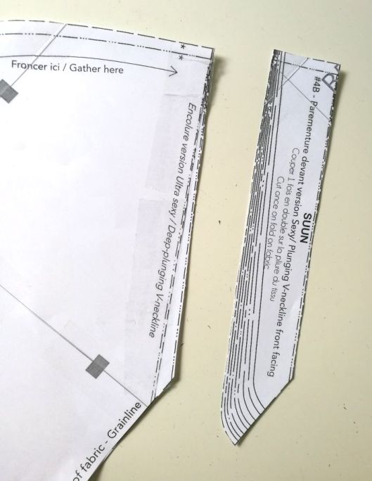 Ce qui ne m’a plu que moyennement c’est le tracé de l’encolure dont le gabarit est à positionner par nos soins. Il faut en effet scotcher l’encolure choisie sur la pièce devant du corsage en faisant coïncider à la fois le milieu devant et le bord supérieur. Par contre, ce qui est bien, c’est que les parementures sont, quant à elles, des pièces bien distinctes : il y a donc trois parementures selon le décolleté choisi.