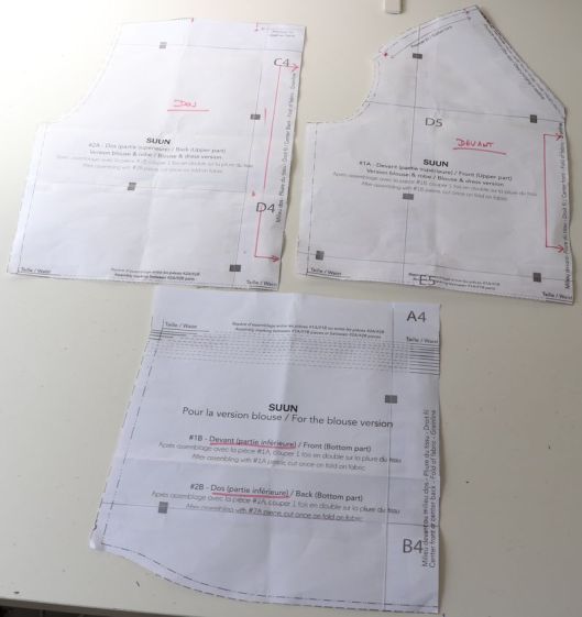 Autre point, il faut reconstituer les pièces 1 et 2 (devant et dos) : la partie basse est en effet commune aux deux pièces. Sauf, que moi, je ne relève jamais un patron PDF, je coupe directement le papier à la bonne taille, je ne décalque pas… C’est certainement par économie de papier car la créatrice précise ceci : « afin que toutes les pièces du patron puissent être contenues sur une et même planche de patron, il a fallu scinder les pièces 1 et 2. » Pour une planche au format A0, je peux comprendre. Pour le format A4, beaucoup moins puisque c’est nous-même qui imprimons… Du coup y’a trois solutions : soit on imprime le bas deux fois (sauf que, tel que c’est positionné, c’est à cheval sur 6 pages alors qu’on aurait pu je pense optimiser sur 4 pages), soit on décalque la partie manquante, soit on prend la pièce du bas qu’on scotche sur l’une et qu’on dé-scotche pour la placer sur l’autre… c’est cette 3ème solution que j’ai choisie et franchement ce n’est pas ce que je préfère…