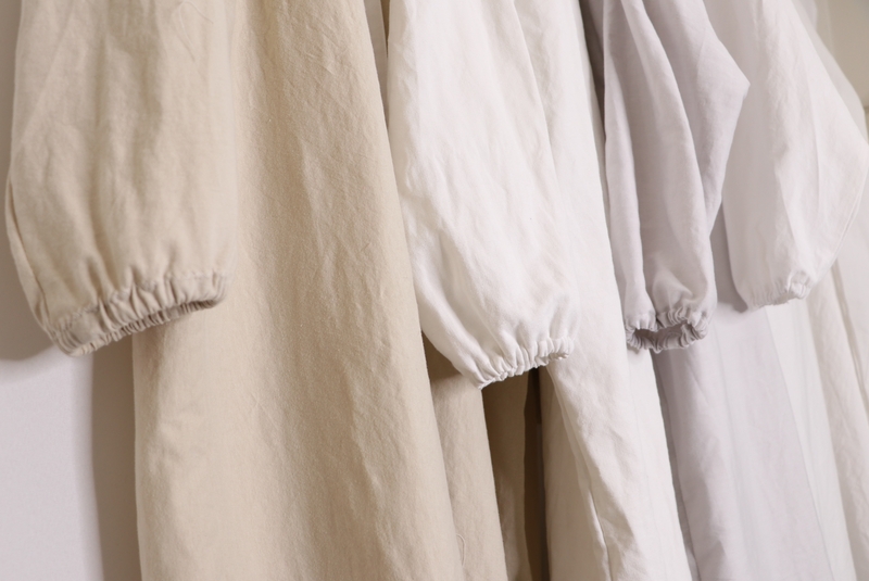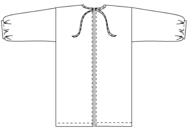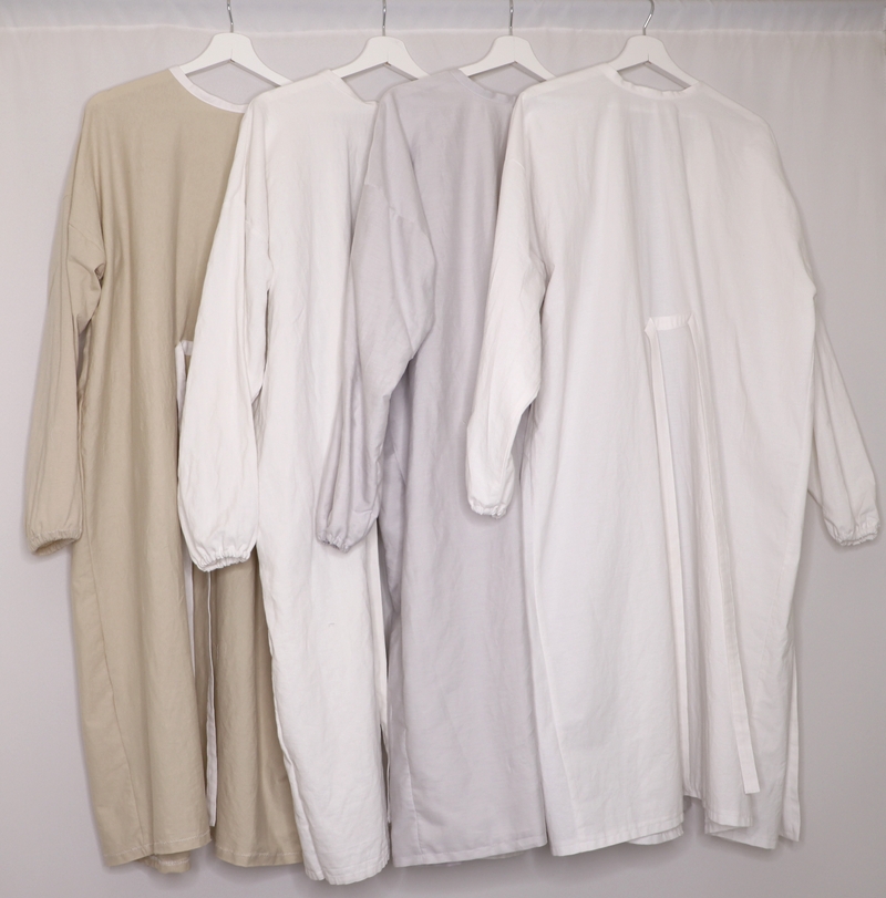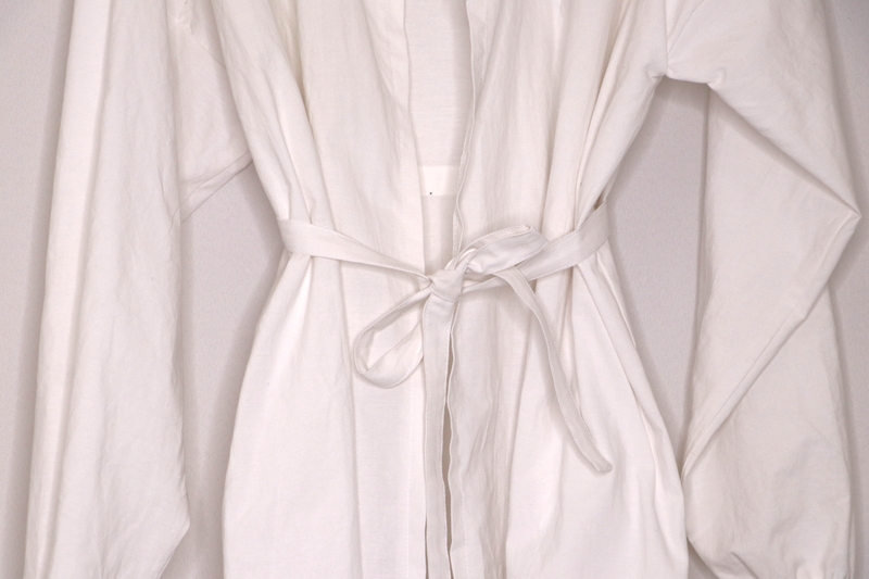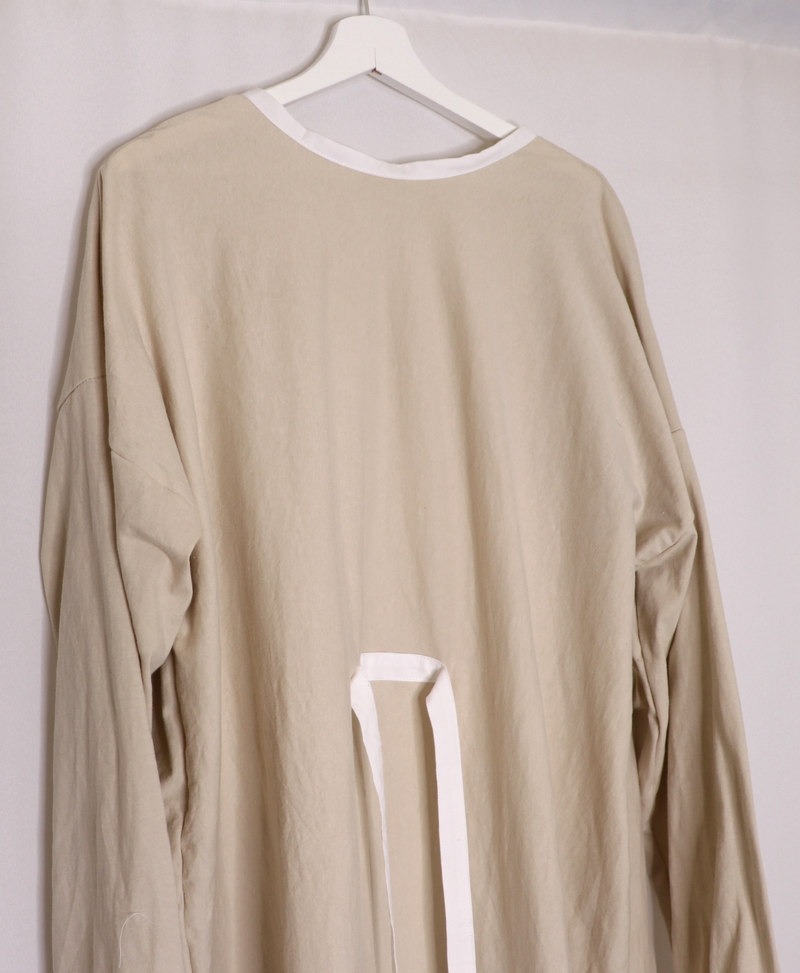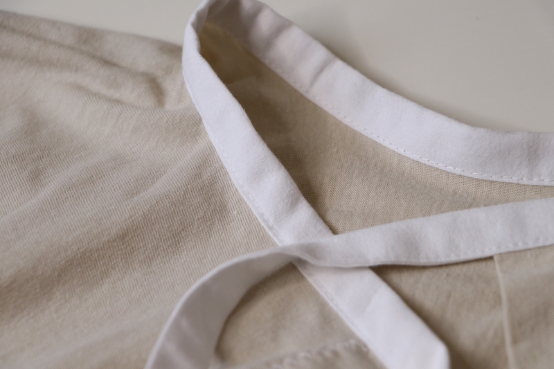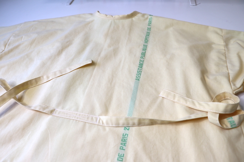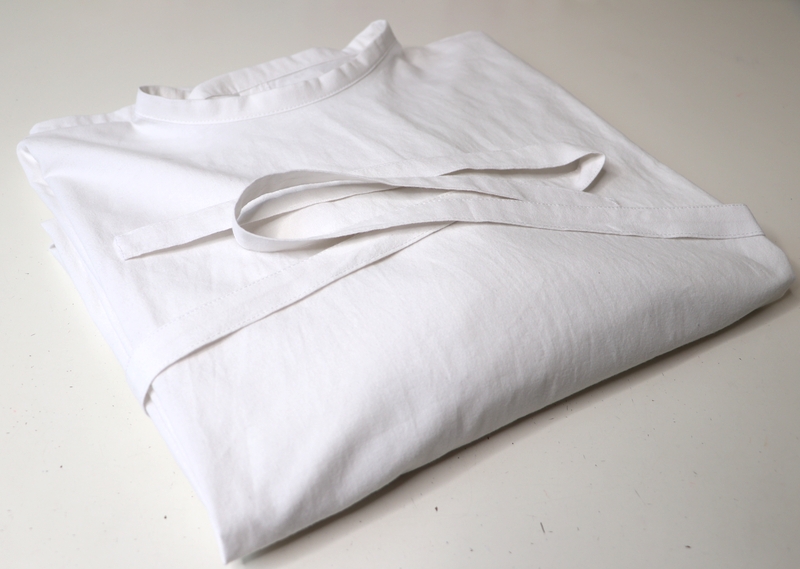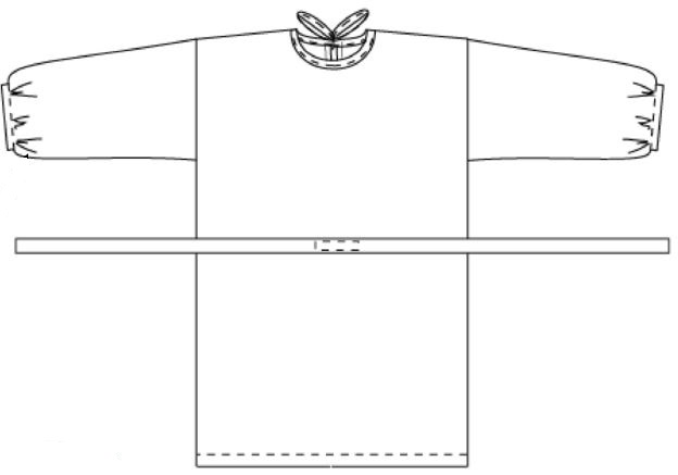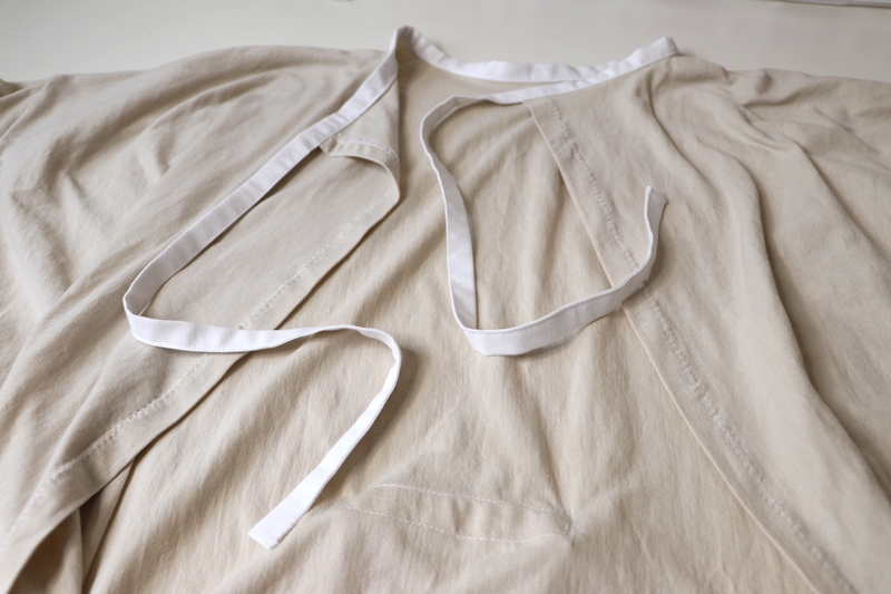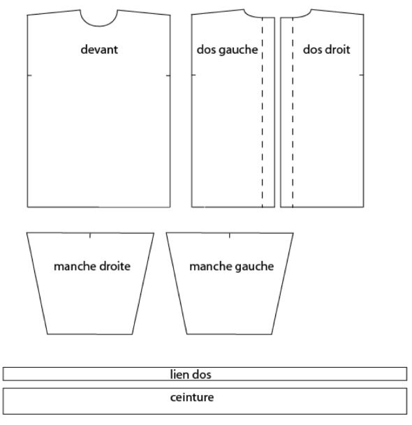 Il s’agit d’une sur-blouse ouverte au dos, qui se ferme par des liens à nouer au niveau de la nuque et de la taille. Les manches sont longues et le bas est élastiqué. Le patron est très basique puisqu’on part de simples rectangles :