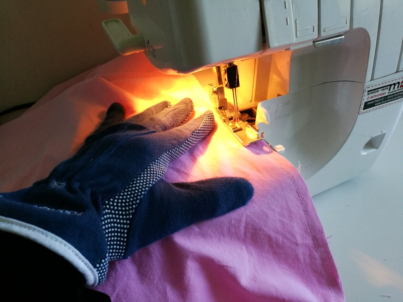 J’ai utilisé la machine à coudre pour l’assemblage et la surjeteuse pour la finition des bords. Comme il s’agit ici de coudre de grandes longueurs droites, je peux vous dire que j’ai appuyé à fond sur la pédale ! Pour bien guider et faciliter le placement du tissu sous le pied de biche, j’ai utilisé un gant de patchwork pour la main gauche et c’était nickel car ça entrainait mieux le tissu et me donnait moins mal au dos et aux bras.