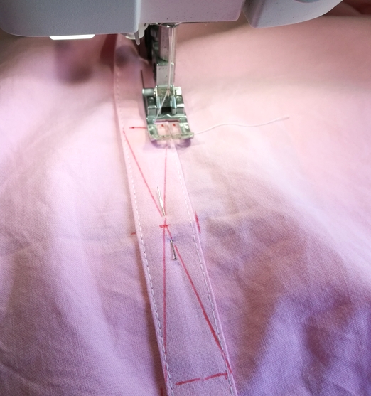 La ceinture est une grande bande qu’on vient surpiquer au devant de la blouse selon les repères indiqués sur le patronage. Pour renforcer le centre de la ceinture, j’ai surpiqué en forme de croix.