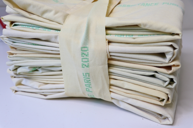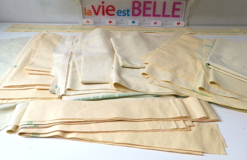 Le fonctionnement était simple, il fallait indiquer le nombre de kit (1 kit = 5 sur-blouses) qu’on voulait coudre (j’en ai pris trois) puis un bénévole (à vélo !!!) venait nous déposer à domicile des sacs poubelles contenant les kits en question, à savoir des draps et des couettes.