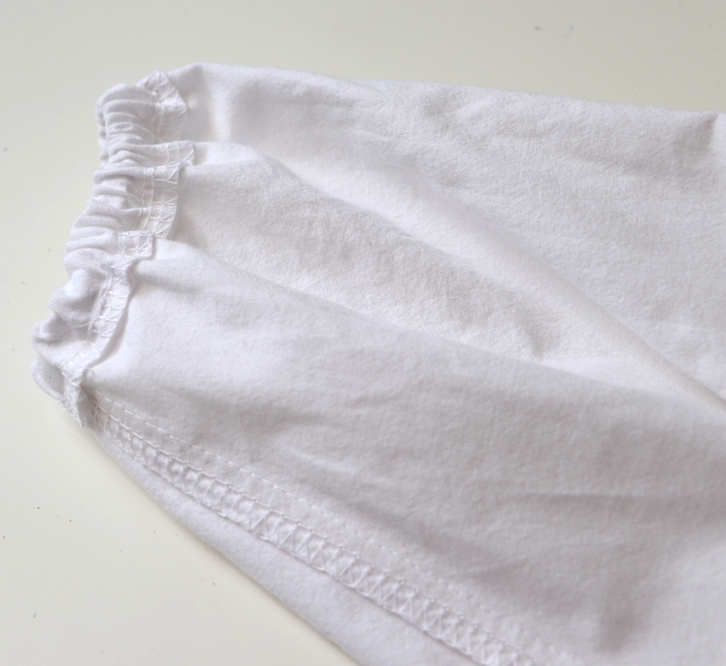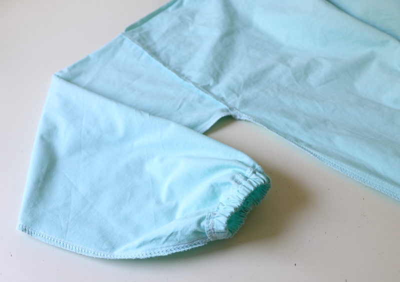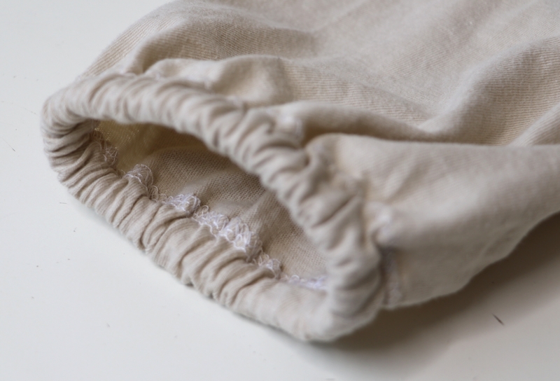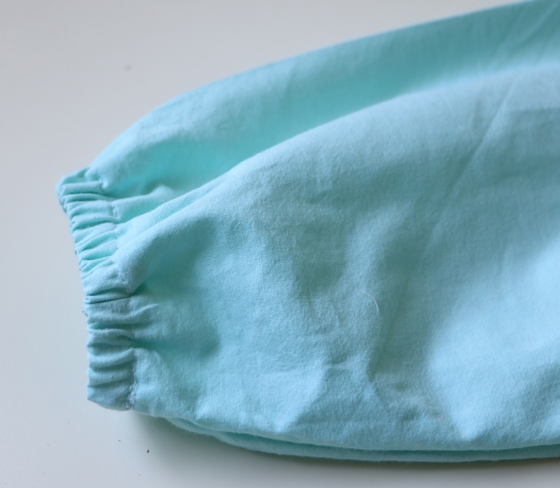 Le bas des manches est élastiqué : c’est un simple ourlet surjeté piqué de 1,5cm dans lequel on insère un élastique. J’ai fait comme j’ai pu pour les élastiques car c’était, à cette époque-là, la pénurie…