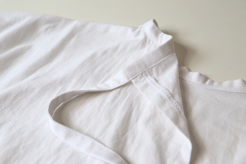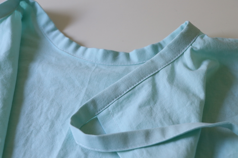 J’ai un peu adapté le patron et les explications pour que ce soit plus cohérent et plus facile à coudre pour moi. J’ai modifié par exemple la longueur des épaules devant et dos, pour que celle-ci corresponde bien. J’ai revu les dimensions du biais à l’encolure, histoire d’avoir des marges de couture de 1 cm au lieu de 0,5cm. Idem pour la bande qui fait office de ceinture. Du coup, plutôt que de coudre la bande endroit contre endroit puis de la retourner sur l’endroit, j’ai préféré coudre une bande comme si c’était un biais (d’où les surpiqûres tout du long).