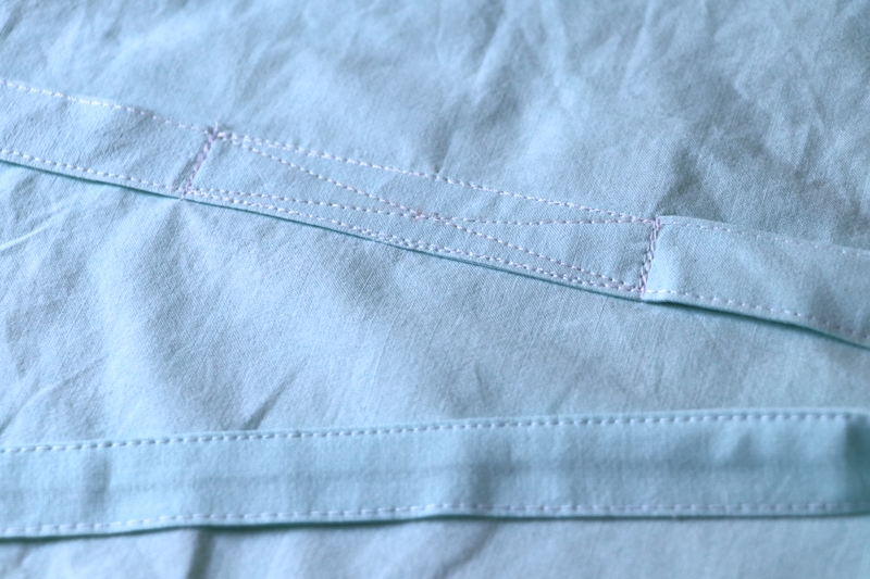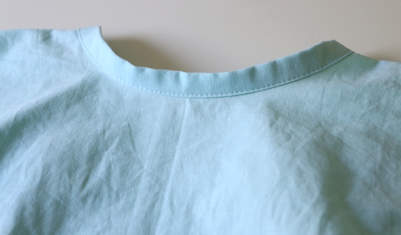 Le milieu dos de la blouse est fini par une parementure à même (comme un ourlet donc) que je suis venue surpiquer avec l’ourlet du bas de la blouse en une seule étape.