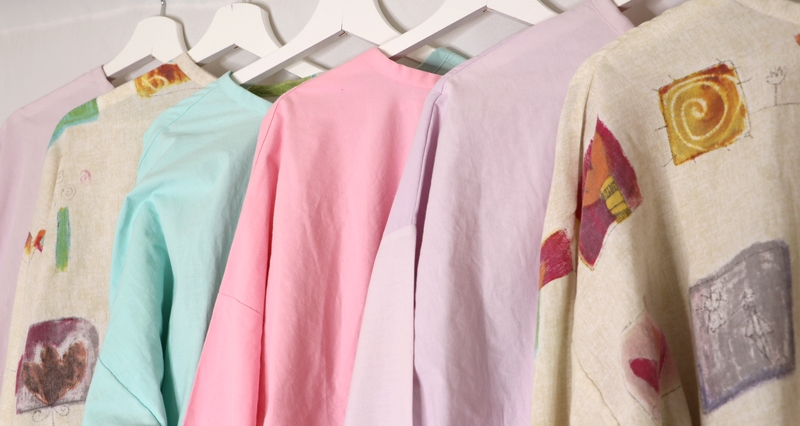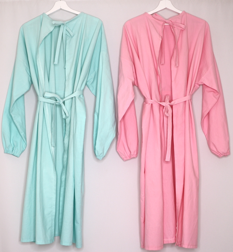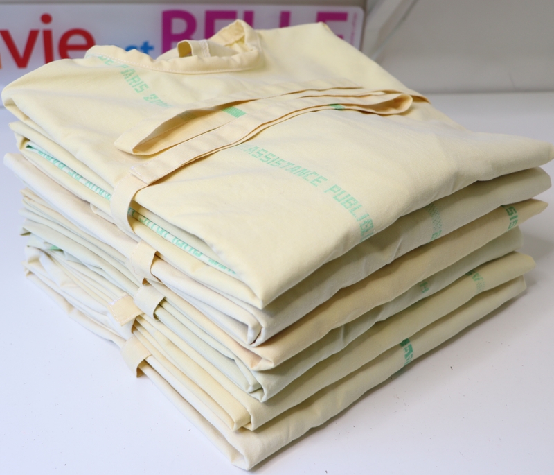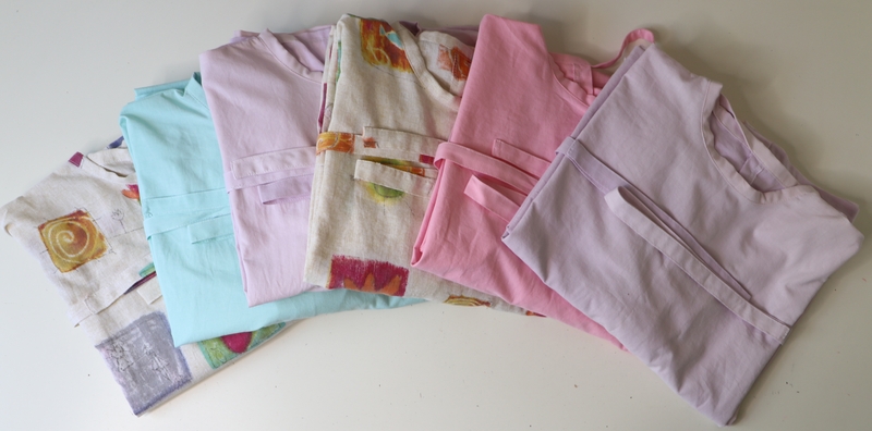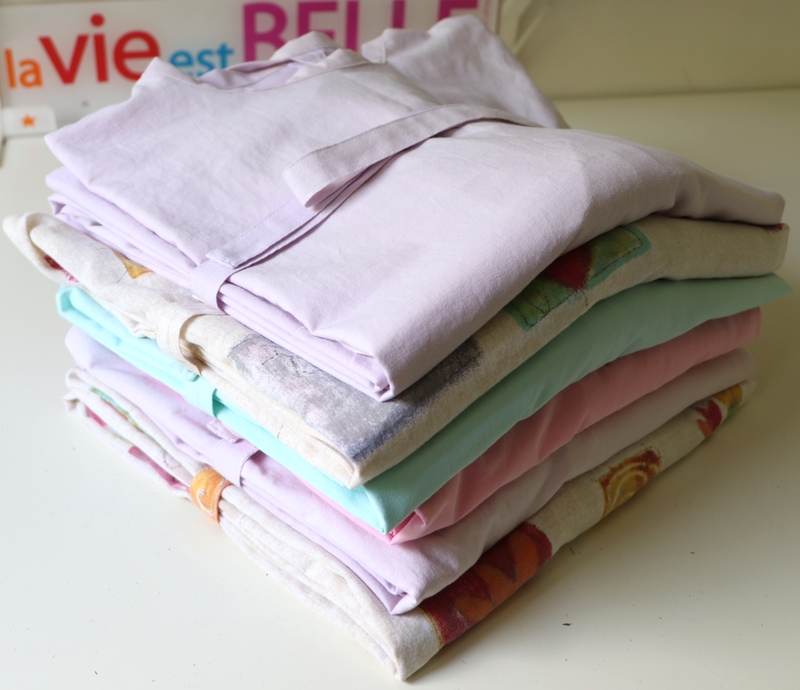 Bref, j’ai ainsi cousu au total 16 sur-blouses : du blanc, du coloré, du rose, du jaune… Moi qui ne couds quasi que du noir ou du gris, j’étais servie !!!