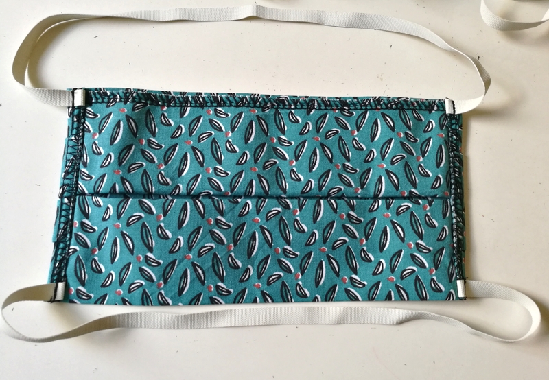 L’occasion pour moi de coudre des masques dans mes chutes de tissus comme par exemple celui-ci (les élastiques viennent se positionner derrière la tête) :