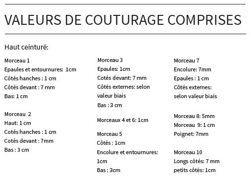 Les valeurs de couture sont incluses mais diffèrent selon l’endroit, ce qui complique la couture car ça demande une concentration supplémentaire. On retrouve ainsi des coutures d’assemblage de 1 cm, de 0,7 cm et de 0,5 cm…