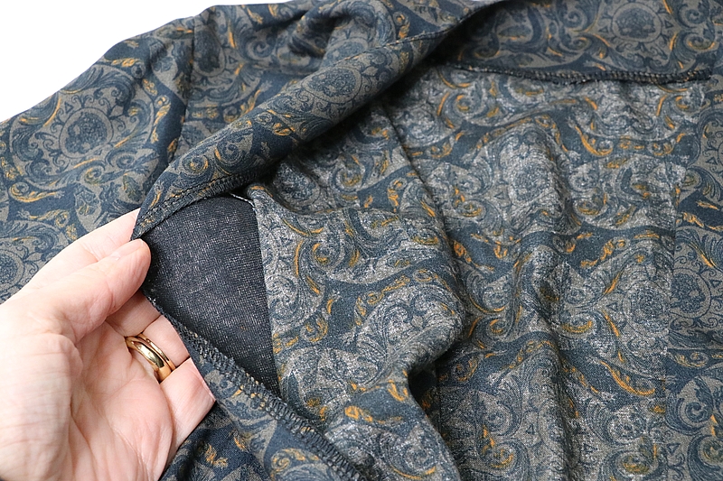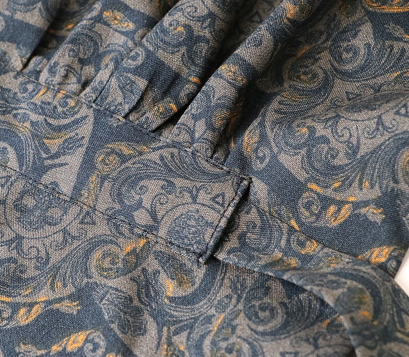 En terme de finitions pour l’encolure, il s’agit de parementures devant et dos. Perso, je n’ai pas gansé les bords de biais (le surfilage me convient très bien comme ça) :