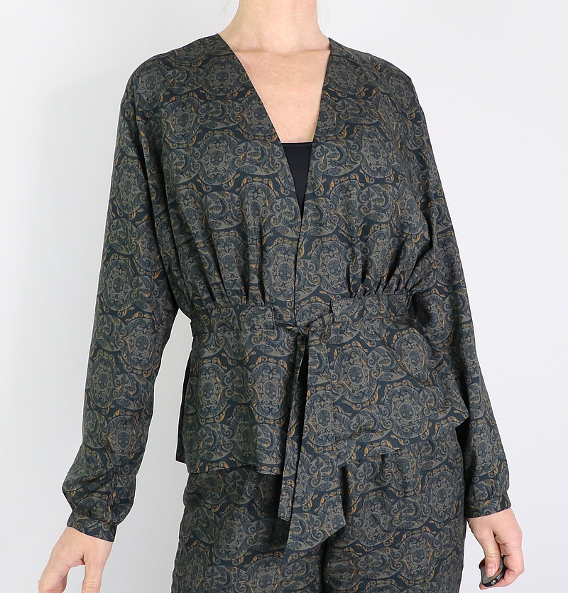 La marque conseille les tissus de type cotons (environ 80gr), batiste, crêpe, twill, voile, viscose. J’ai opté pour une viscose de mon stock qui vient de chez Toto Tissus : la même que pour mon pantalon Saïki, histoire d’avoir un ensemble coordonné. Le métrage nécessaire pour coudre ce top Tulle est 1m35 – laize 140 cm (tailles XS-S) + un morceau de tissus d’env. 70 cm pour la ceinture (je n’ai pas vérifié).
