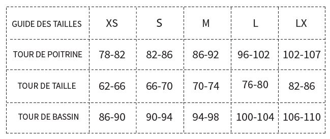 Ce patron est proposé de la taille XS à XL (et non LX !). Perso, je n’aime pas ce barème de tailles que je trouve approximatif. Je préfère un tableau avec des tailles bien distinctes (36, 38, 40…). Ici pas de tableau avec les mesures finies du vêtement.