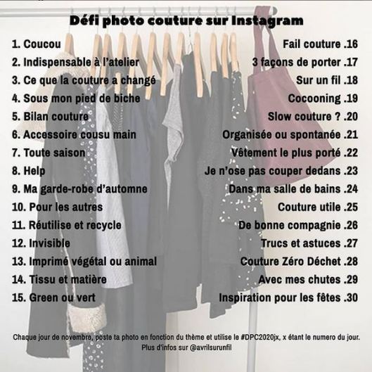 J’ai à nouveau participé au défi lancé par Virginie alias @avrilsurunfil ! Cette année, il y en a eu deux. C’est une initiative absolument fabuleuse : une occasion de partage et d’échange que je trouve hyper enrichissante ! Le principe était simple : pendant un mois, chaque jour, les participant(e)s postaient une photo sur Instagram d’après un thème donné et défini à l’avance, comme vous pouvez le voir ci-dessous. Je n’étais toutefois pas forcément inspirée par tous les thèmes, je n’y ai donc pas participé tous les jours…