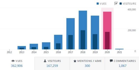 Qui dit bilan, dit statistiques ! Voici donc quelques chiffres : ce blog a comptabilisé 362 906 (324 056 vues en 2019). Une petite hausse donc… contrairement à 2019 où la chute avait vraiment été significative. Peut-être est-ce dû au premier confinement car le constat est flagrant : mon blog a connu un sacré rebond en mars, avril et mai 2020.