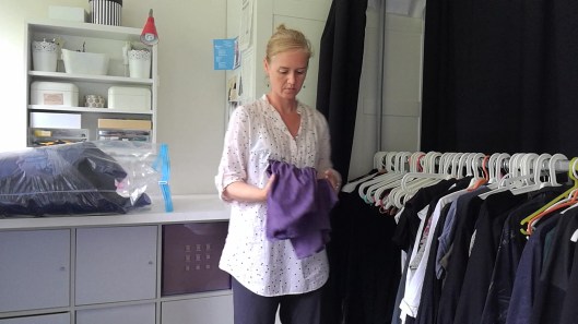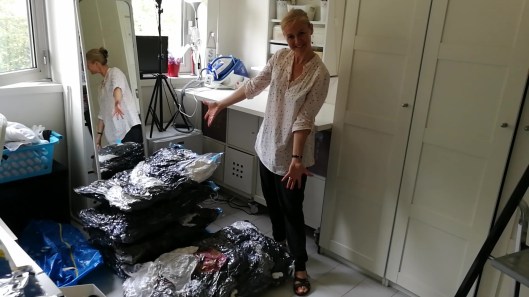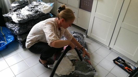 Ci-dessous dans les fameux sacs, ce sont toutes les cousettes de mon portant. Autrement dit, une petite partie de ma garde-robe car il restait encore à faire toute la grande armoire (que je partage avec mon mari)… Et je ne vous parle pas de la phase repassage une fois les travaux finis… Et oui, il fallait que je repasse tous mes vêtements qui étaient du coup froissés !