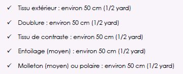 Pour info, côté tissus, la créatrice nous propose différentes matières : cotons légers, jean, velours, jacquard, simili ou cuir. Côté métrage, il est indiqué de prendre 50 cm de tissu pour l’extérieur mais la laize n’est pas précisée, ce qui est un peu embêtant… Idem pour les autres matières :
