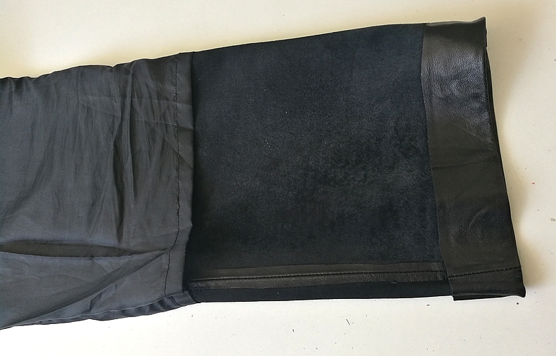 Pour la petite anecdote, j’ai récupéré à Noël un pantalon en cuir que mon père ne portait plus et que mes parents comptaient mettre à la benne à recycler. Heureusement qu’ils ont eu un éclair de lucidité et qu’ils se sont rappelés que leur fille avait pour passion la couture ! Bref, j’ai récupéré ce pantalon en cuir de taille 44 qui m’a permis de le transformer en sac à main ! Il est marqué sur l’étiquette de ce pantalon « véritable cuir agneau Nappa », dont voici la définition (merci Google !) : « Le cuir nappa est un cuir lisse, de très bonne qualité, qui est imperméable et résistant au soleil. En surface de la peau d’agneau le cuir nappa a été traité pour le rendre plus souple qu’un cuir pleine fleur.«